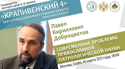 10 марта 2021 года в Российском православном университете св. Иоанна Богослова в Москве состоялось очередное заседание научного лектория «Крапивенский 4». С докладом на тему «Современные проблемы православной патрологической науки» выступил доцентр кафедры богословия Московской духовной академии кандидат философских наук, кандидат богословия П.К. Доброцветов. Мероприятие прошло при поддержке Научно-аналитического центра Всемирного русского народного собора и Русской экспертной школы.
