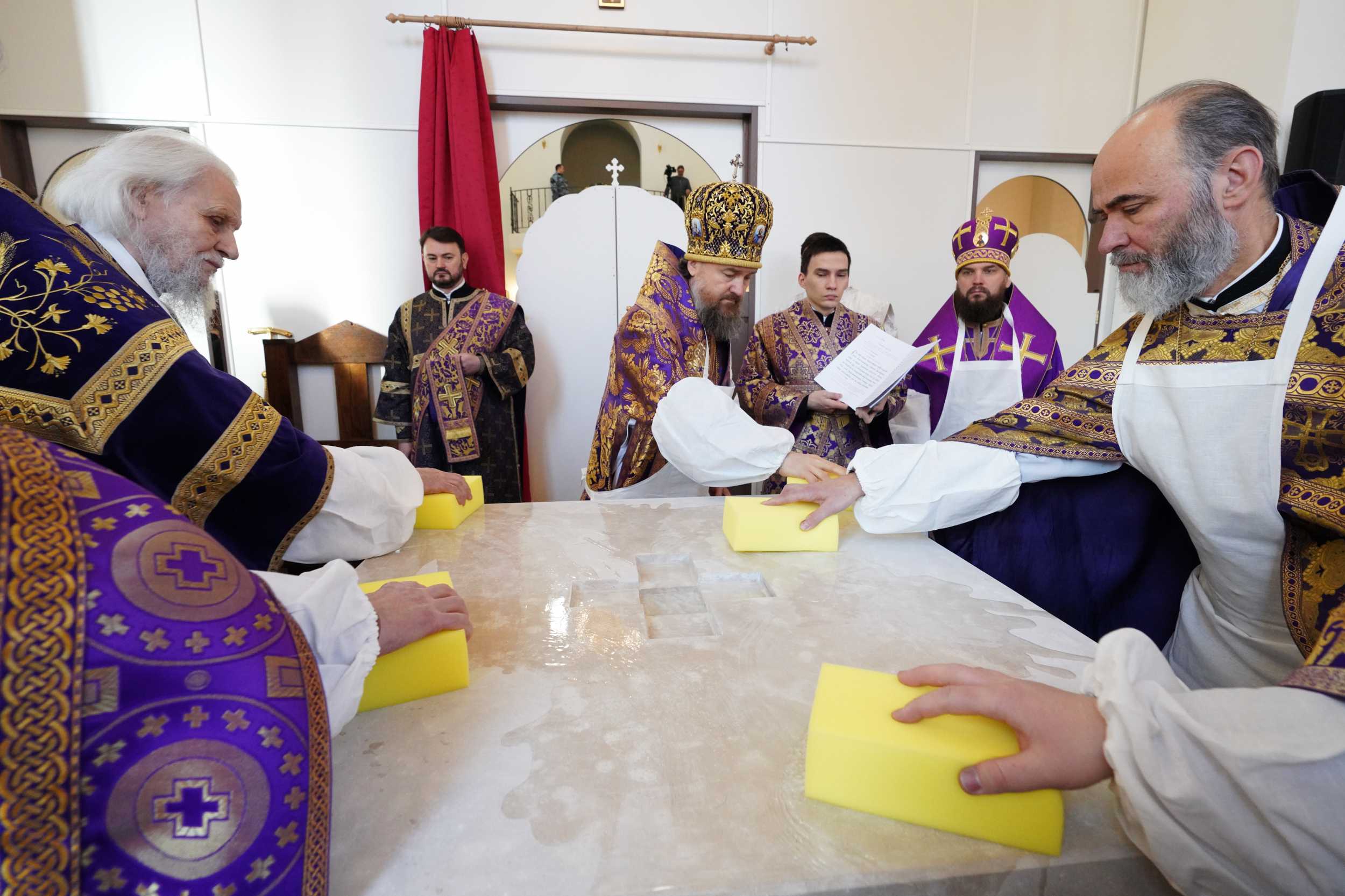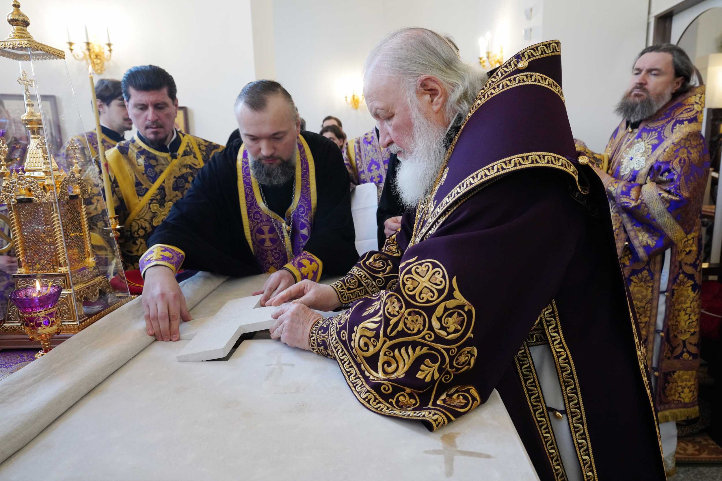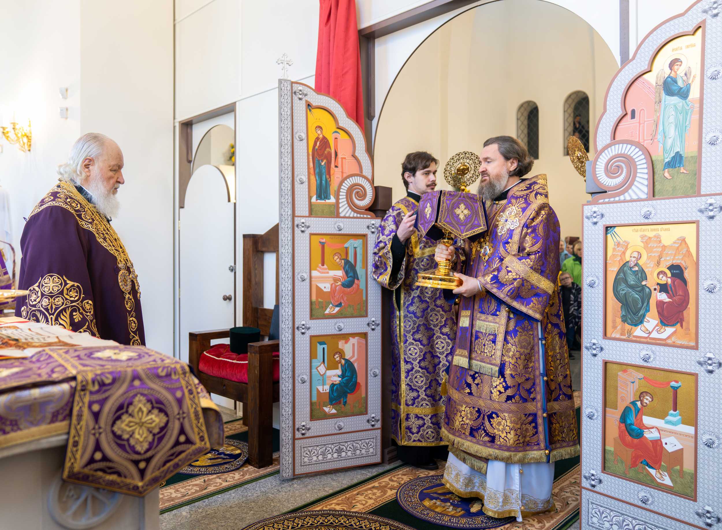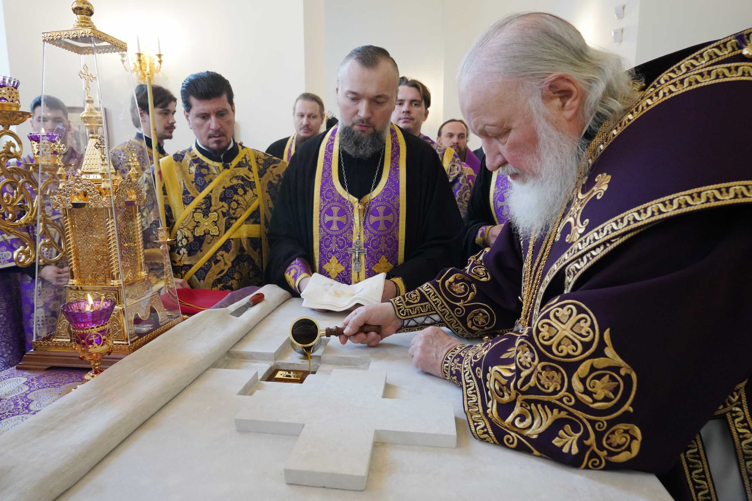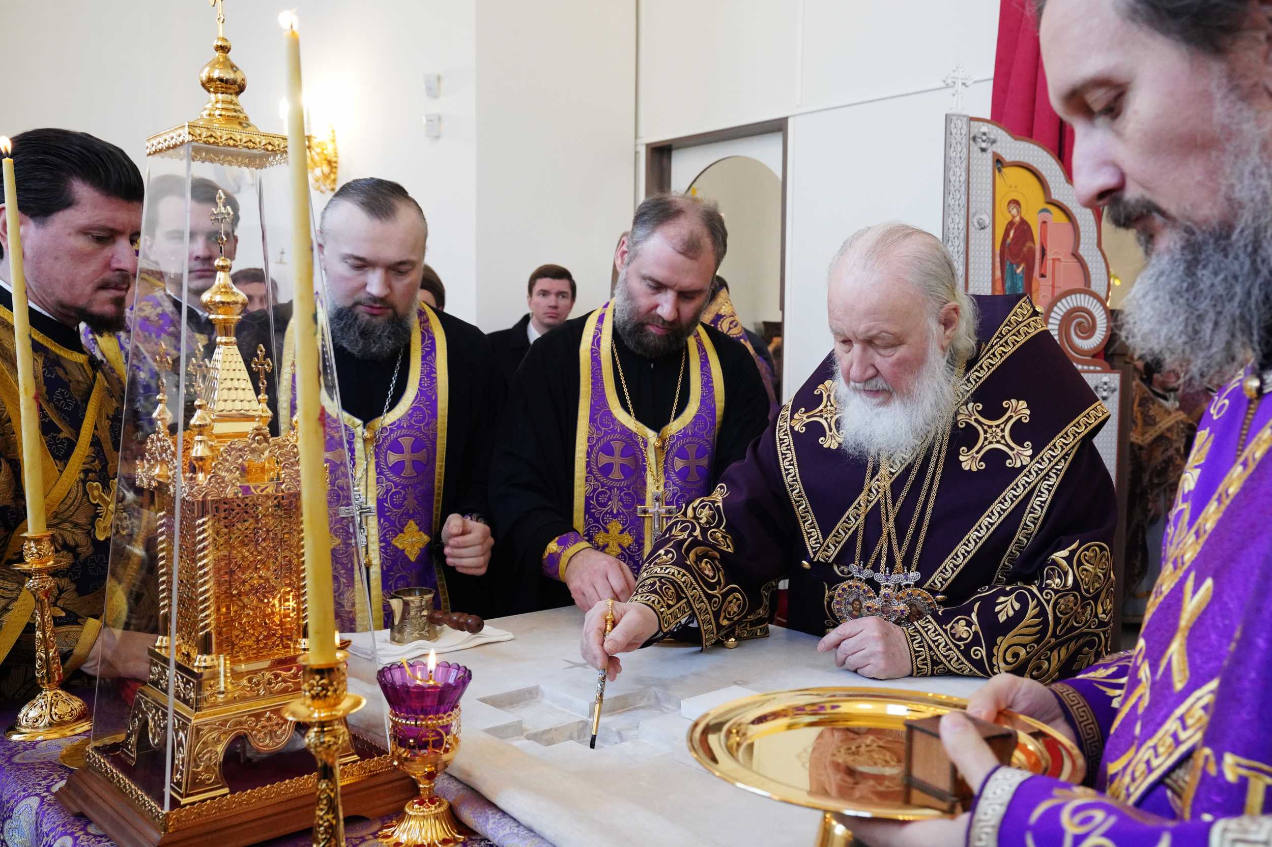Предстоятель Русской Православной Церкви освятил основной престол в честь блаженной Ксении Петербургской, северный — в честь благоверного князя Иоанна Калиты, а также 20 антиминсов.