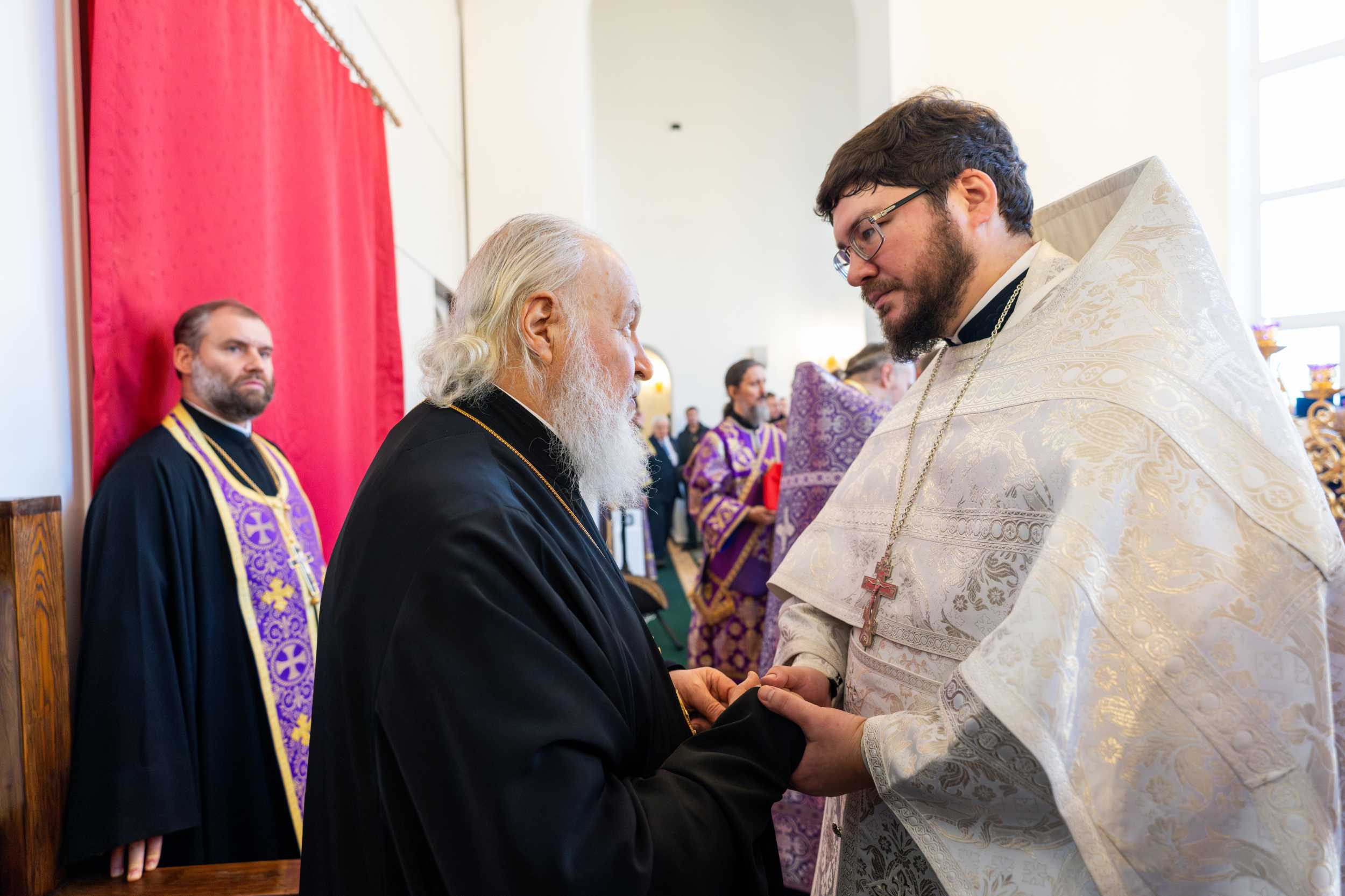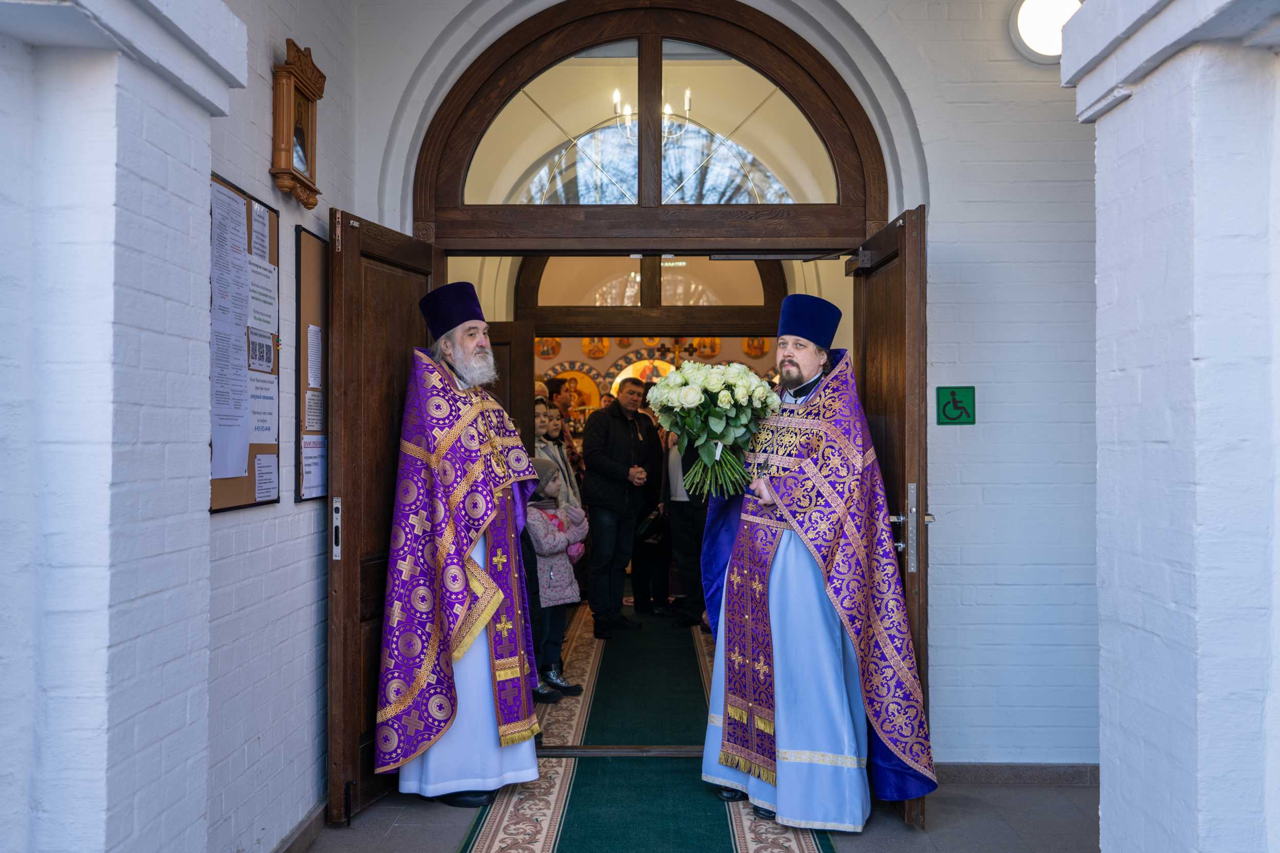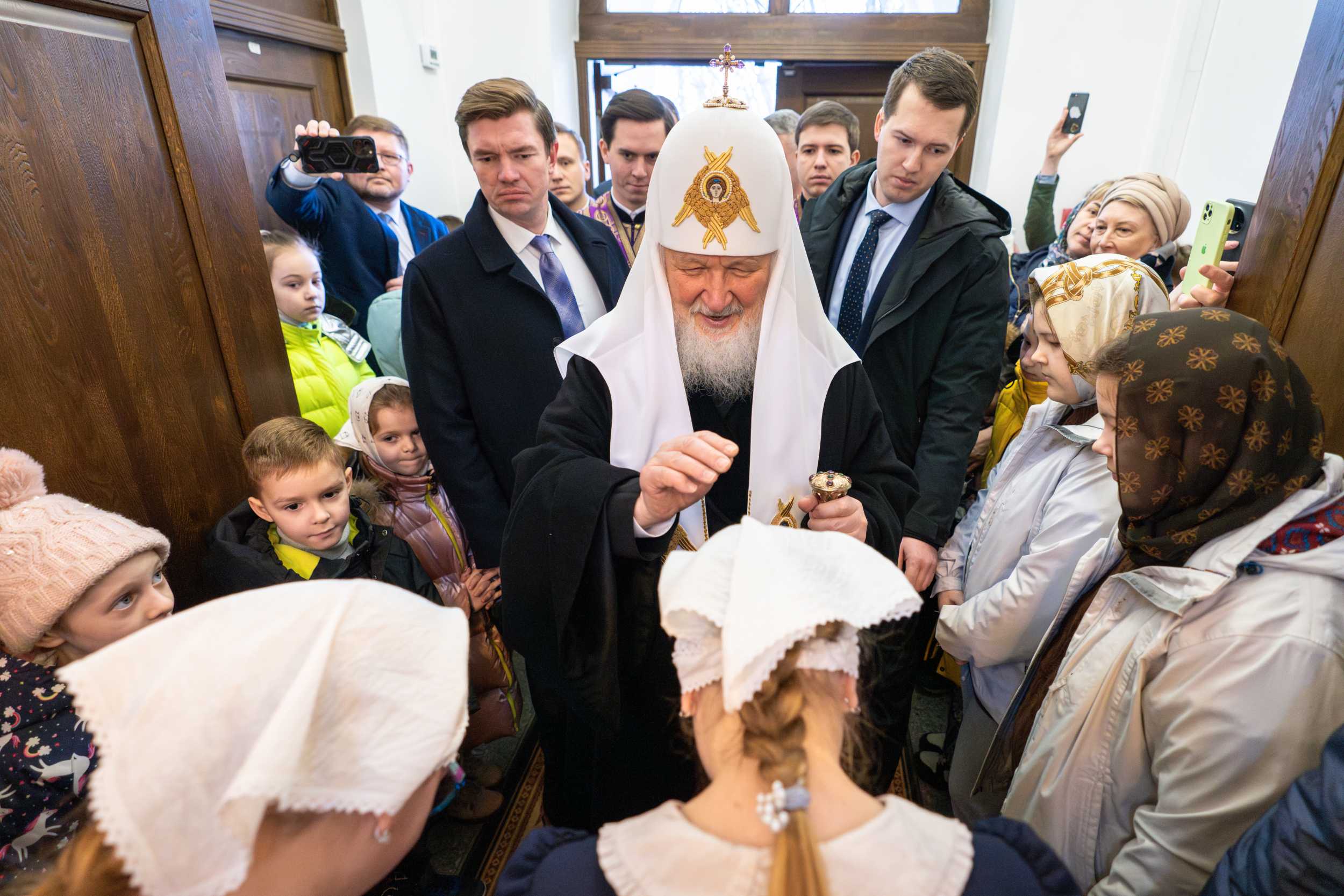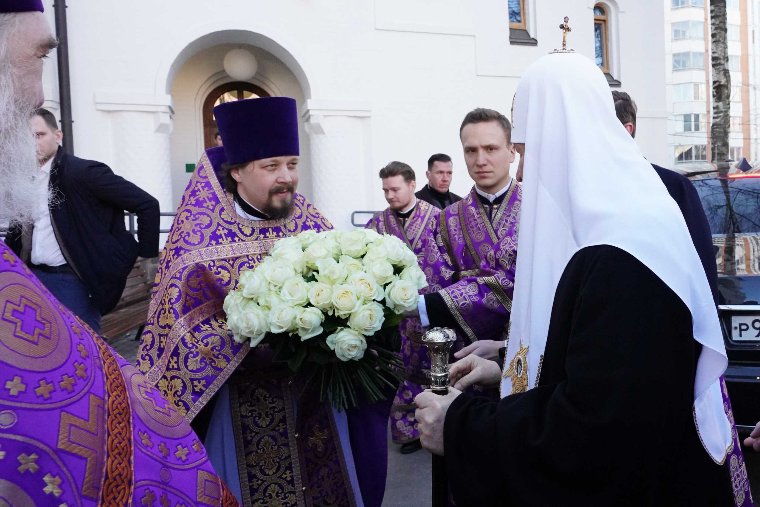 Перед началом богослужения у врат храма Святейшего Владыку встречали: протоиерей Сергий Куликов, благочинный Знаменского округа, настоятель храма мучеников и бессребреников Космы и Дамиана в Космодемьянском г. Москвы; иерей Михаил Кузелев, настоятель храма блаженной Ксении Петербургской в Бескудникове г. Москвы; учащиеся воскресной школы новоосвященного храма.
