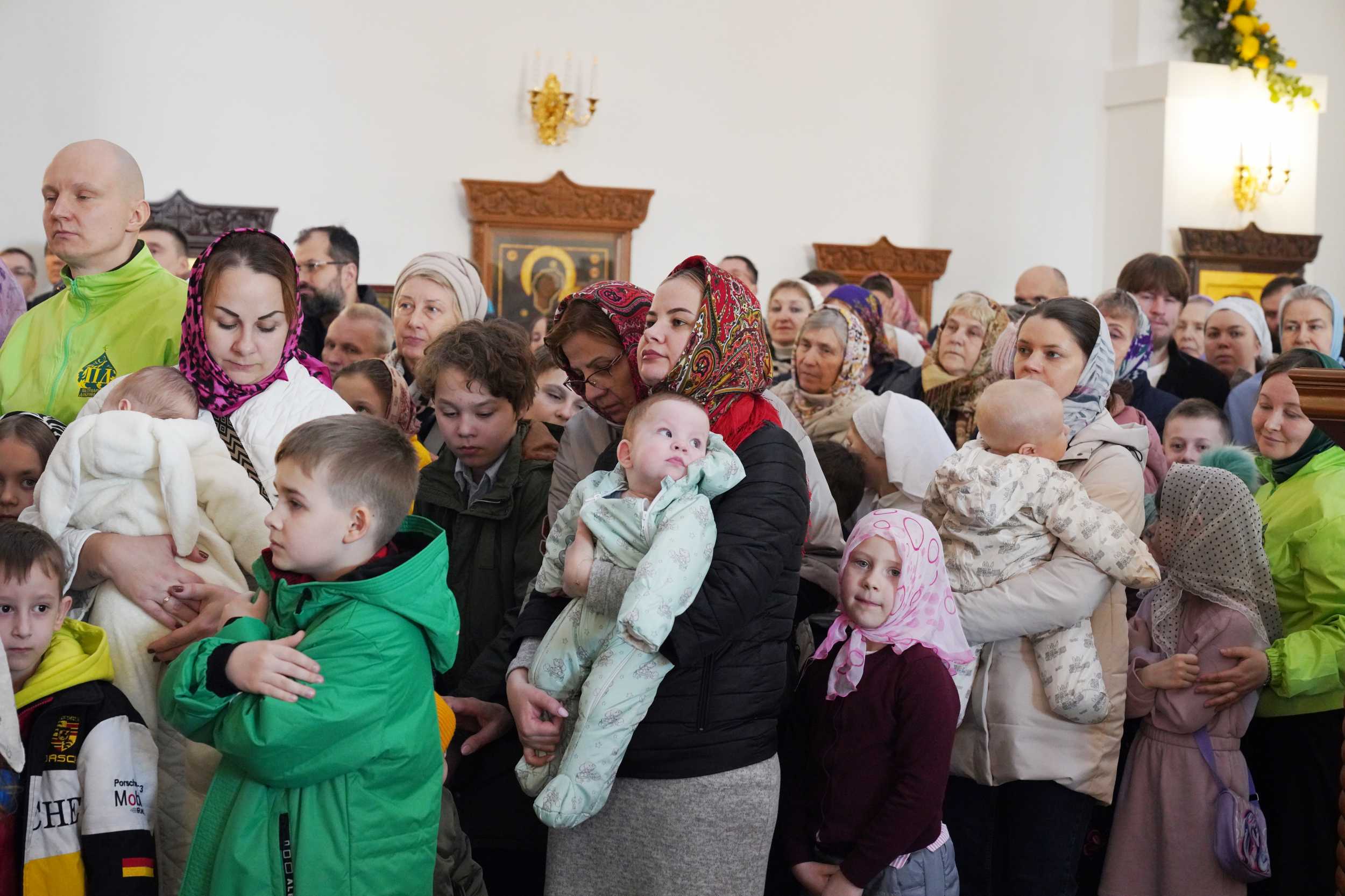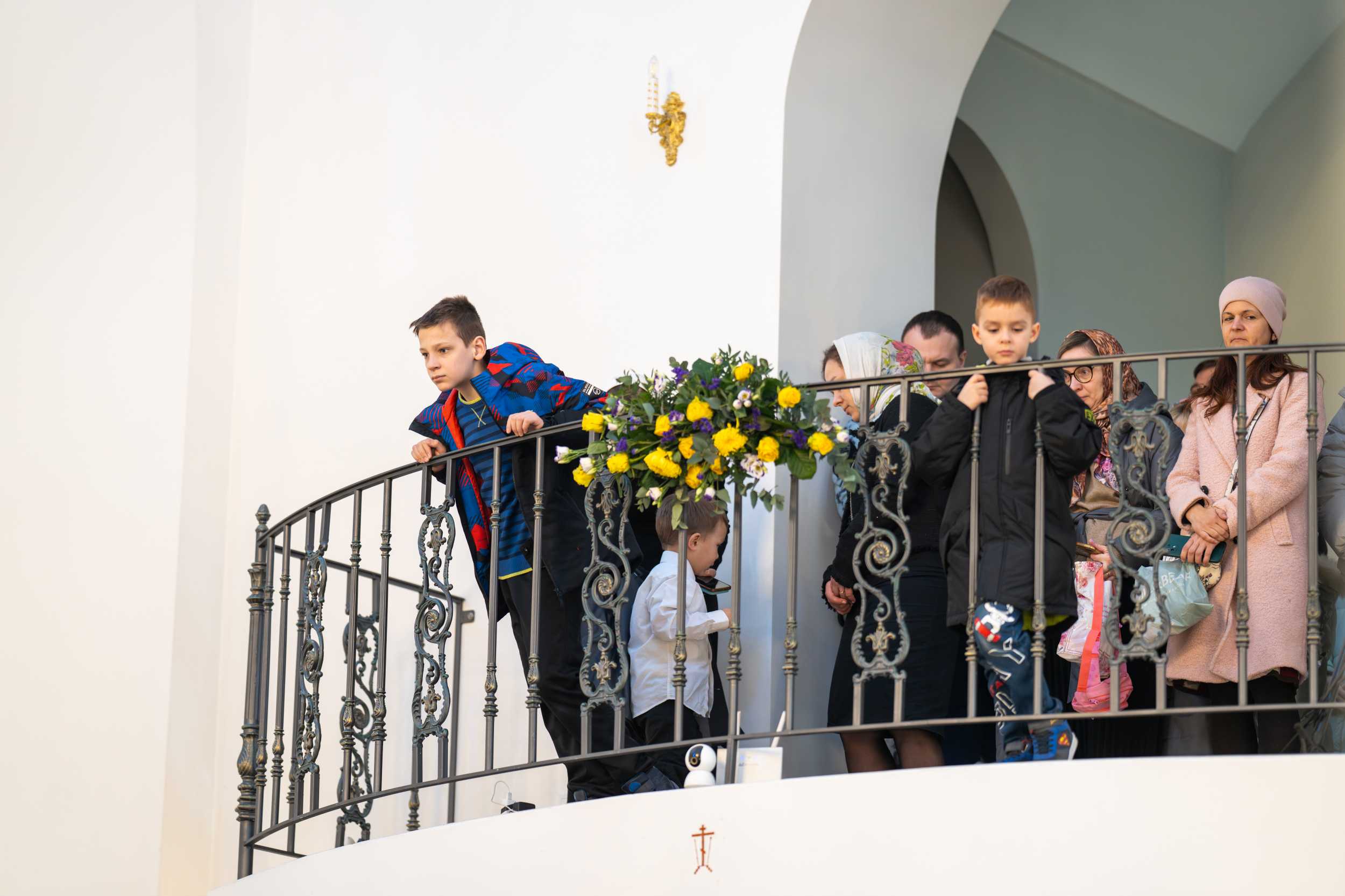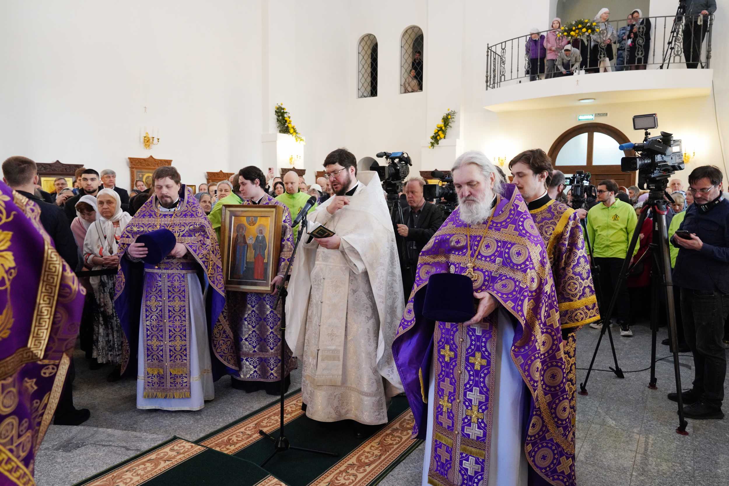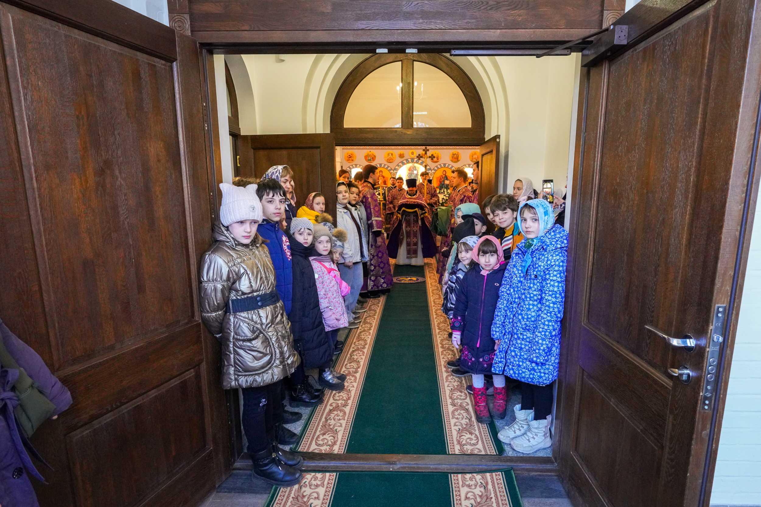 Перед началом богослужения у врат храма Святейшего Владыку встречали: протоиерей Сергий Куликов, благочинный Знаменского округа, настоятель храма мучеников и бессребреников Космы и Дамиана в Космодемьянском г. Москвы; иерей Михаил Кузелев, настоятель храма блаженной Ксении Петербургской в Бескудникове г. Москвы; учащиеся воскресной школы новоосвященного храма.