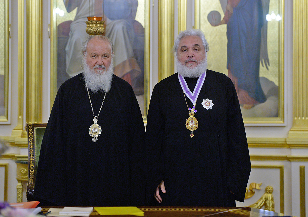 В Русском на Афоне Свято-Пантелеимоновом монастыре Святейший Патриарх Московский и всея Руси Кирилл совершил молебен в соборе святого великомученика Пантелеимона, всенощное бдение и Божественную литургию в Покровском соборе обители, вручил церковные награды ряду лиц, особо потрудившихся над восстановлением мест русского монашеского присутствия на Святой горе.