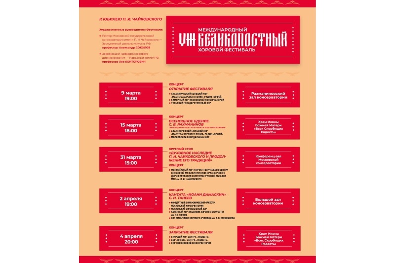 Художественные руководители VIII Международного Великопостного хорового фестиваля — ректор Московской государственной консерватории имени П.И. Чайковского заслуженный деятель искусств РФ профессор А.С. Соколов и заведующий кафедрой хорового дирижирования народный артист РФ профессор Л.З. Конторович. Куратор программы фестиваля — заслуженный артист России художественный руководитель Московского Синодального хора А.А. Пузаков.