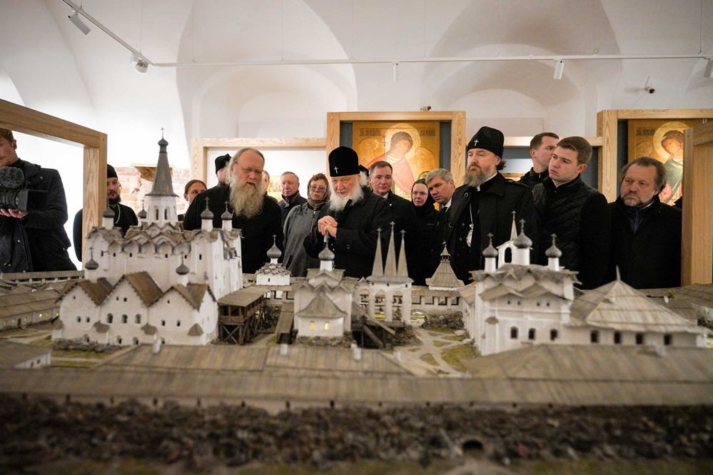 Затем Святейший Патриарх Кирилл ознакомился с ходом ремонтно-реставрационных работ в монастыре, начав осмотр обители со cвятых врат, далее проследовал к часовням вне стен монастыря — в честь апостолов Петра и Павла и в честь благоверного князя Александра Невского. Святейший Владыка также посетил Святительский корпус и место у восточной стены монастыря, где осуществлялись расстрелы заключенных. Далее Предстоятель осмотрел результаты работ в Германовской церкви монастыря и новые купола и кресты, установленные на Никольском и Благовещенском храмах обители, после чего проследовал в помещение монастырской ризницы, где ознакомился с экспозицией устроенной в ней выставки. В завершение Его Святейшеству было продемонстрировано экспозиционное пространство, расположенное на пандусе над археологической зоной на месте Казначейского корпуса.