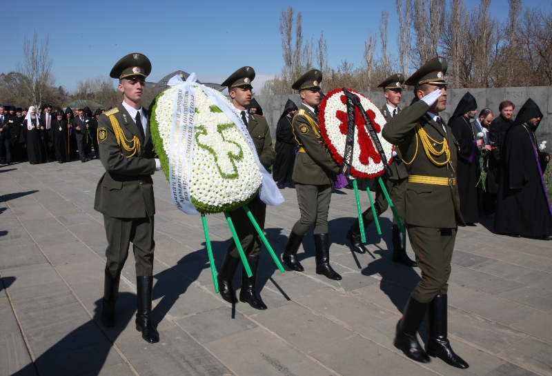 Святейший Патриарх Кирилл и Католикос всех армян Гарегин II возложили венки к постаменту. Надпись на ленте венка от Предстоятеля Русской Церкви гласит «Вечная память сынам и дочерям армянского народа, погибшим во время геноцида 1915 года. Патриарх Московский и всея Руси Кирилл».