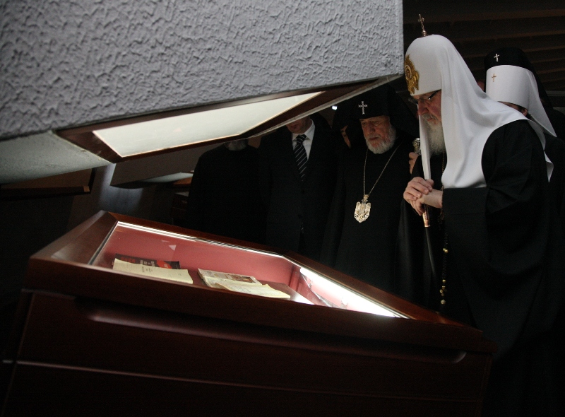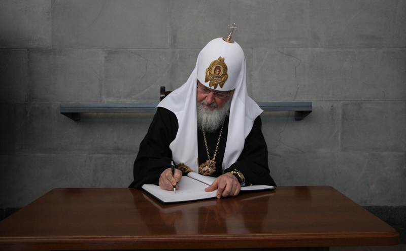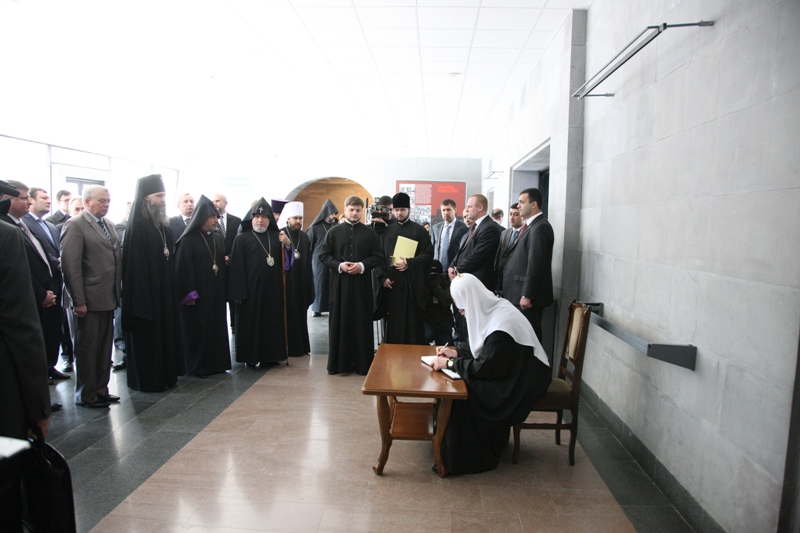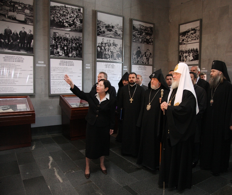 Затем Святейший Владыка ознакомился с экспозицией Музея геноцида. О трагических страницах армянской истории Его Святейшеству рассказала научный сотрудник Музея-института геноцида Астхик Едигарян. Святейший Патриарх Кирилл оставил запись в книге почетных посетителей музея.