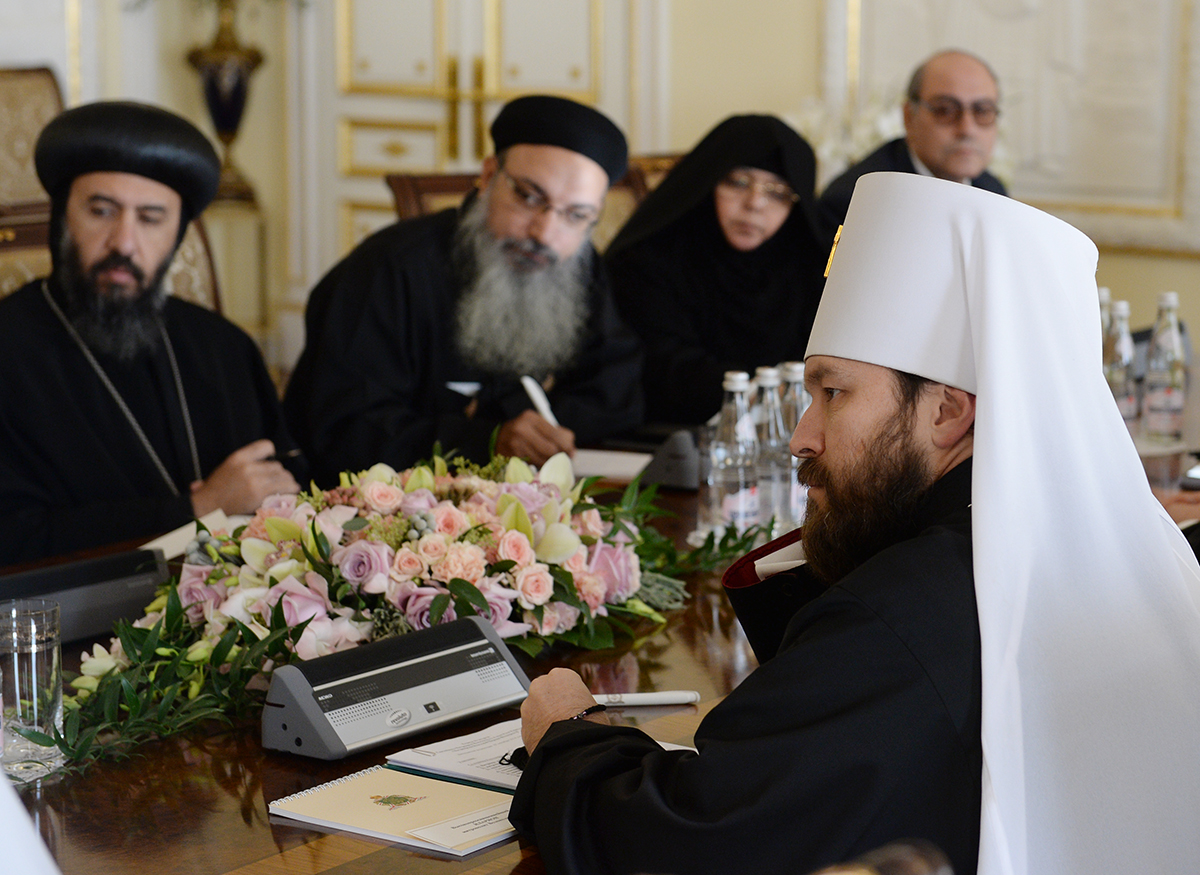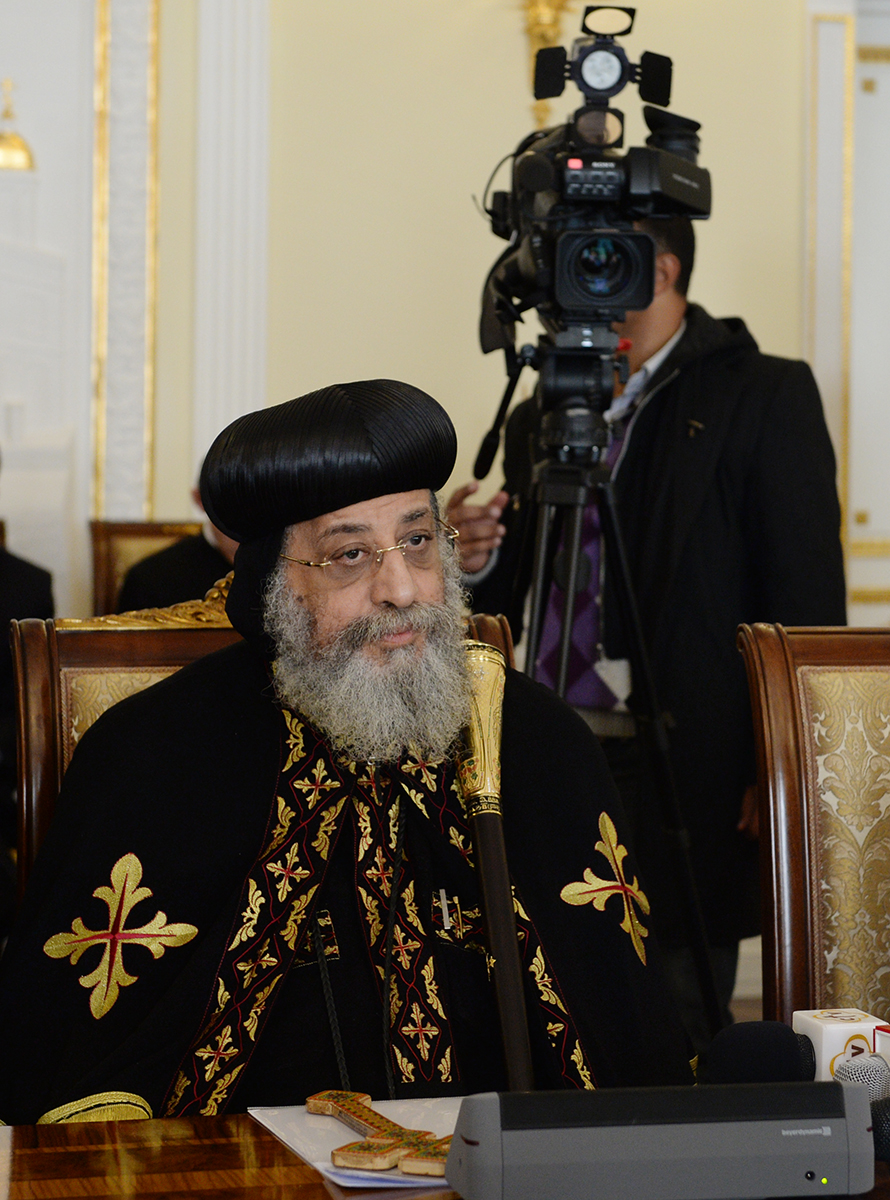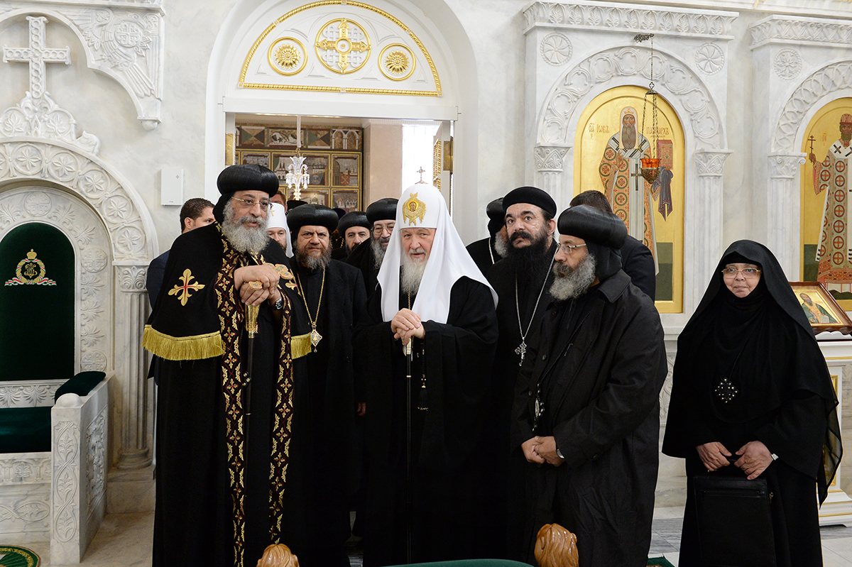 «В 2011-2013 годах ваша Церковь оказалась в тяжелейшей ситуации, когда против нее было начато открытое гонение, — сказал Святейший Патриарх Кирилл Предстоятелю Коптской Церкви. — Разрушали храмы, происходили убийства людей — все это привело к тому, что около 200 тысяч коптов покинули Египет. Вы, конечно, знаете, что Русская Православная Церковь не раз делала заявления, возвышая свой голос в защиту христиан Египта и всего Ближнего Востока. Мы находились в прямом контакте с государственным руководством Российской Федерации по этим вопросам. Как Вы знаете, усилия России были направлены на защиту, в том числе, и христианского населения Египта. Мы также работали с различного рода международными организациями и использовали все наши двусторонние контакты, в том числе встречи Патриарха с главами государств, для того, чтобы привлечь внимание к этой проблеме».