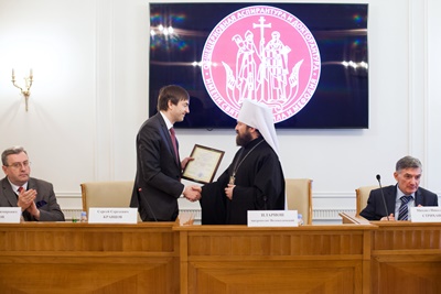 Затем руководитель Рособрнадзора вручил митрополиту Волоколамскому Илариону свидетельство о государственной аккредитации религиозной организации — духовной образовательной организации высшего образования Русской Православной Церкви «Общецерковной аспирантуры и докторантуры имени святых равноапостольных Кирилла и Мефодия» по теологии (высшее образование — магистратура и теология, высшее образование — подготовка кадров к высшей квалификации).