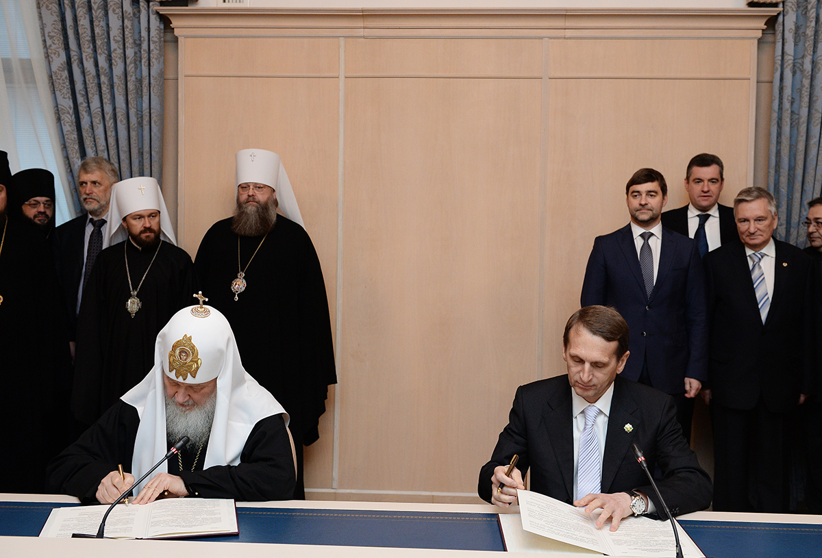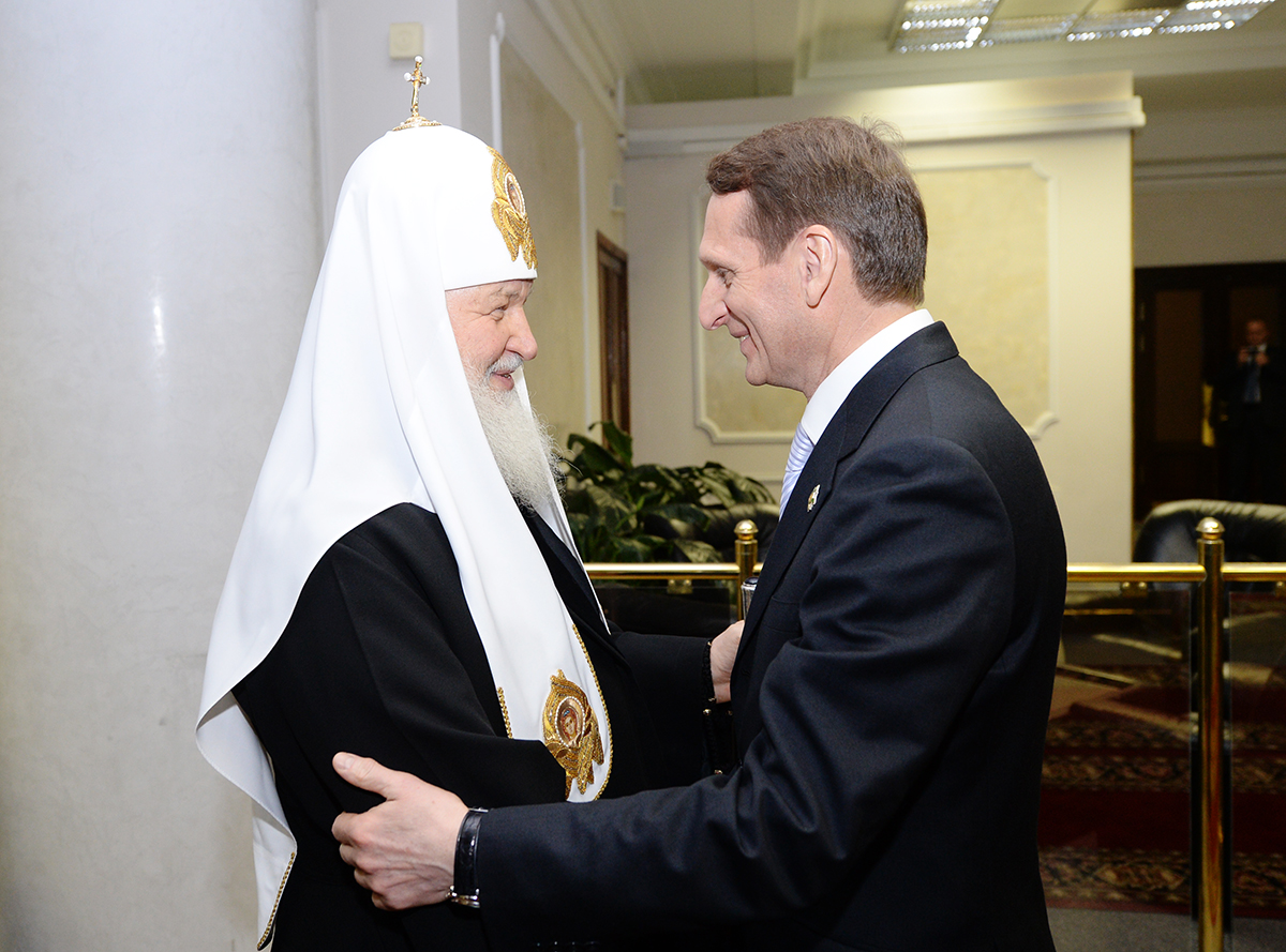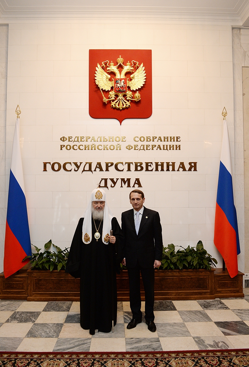 Особую благодарность выражаю Сергею Евгеньевичу Нарышкину, председателю Государственной Думы, и Валентине Ивановне Матвиенко, председателю Совета Федерации, за важные инициативы, поддержку, плодотворную совместную работу, за то внимание, которое Федеральное Собрание уделяет жизни и служению Русской Православной Церкви и другим религиям и конфессиям России.