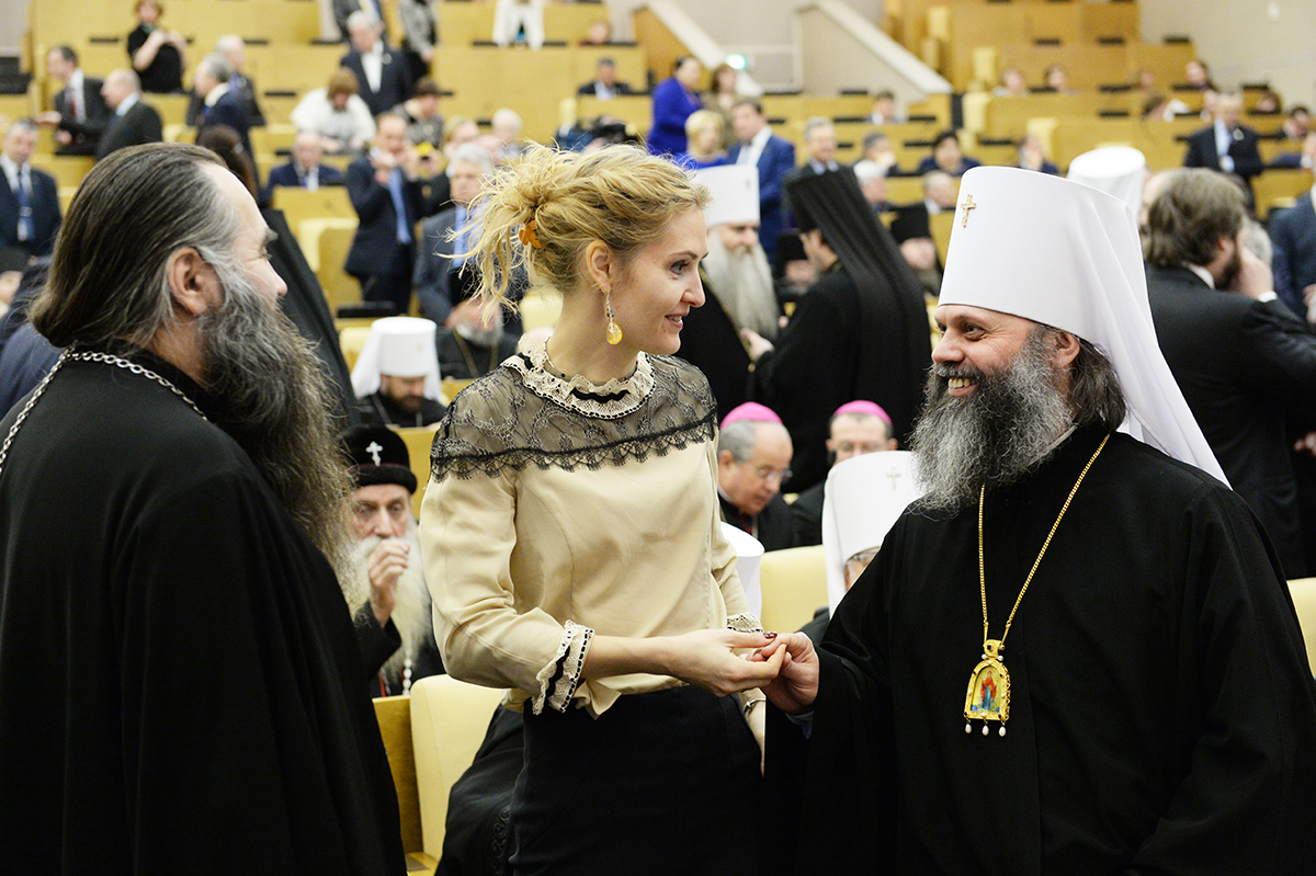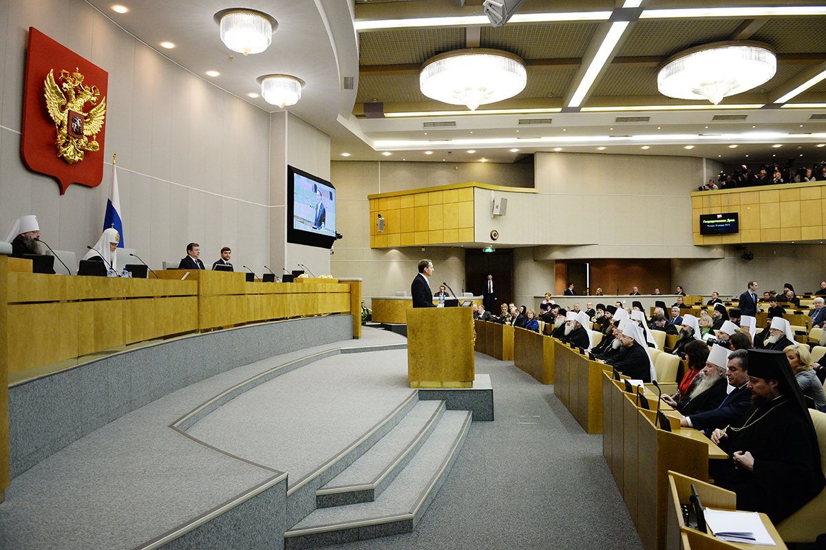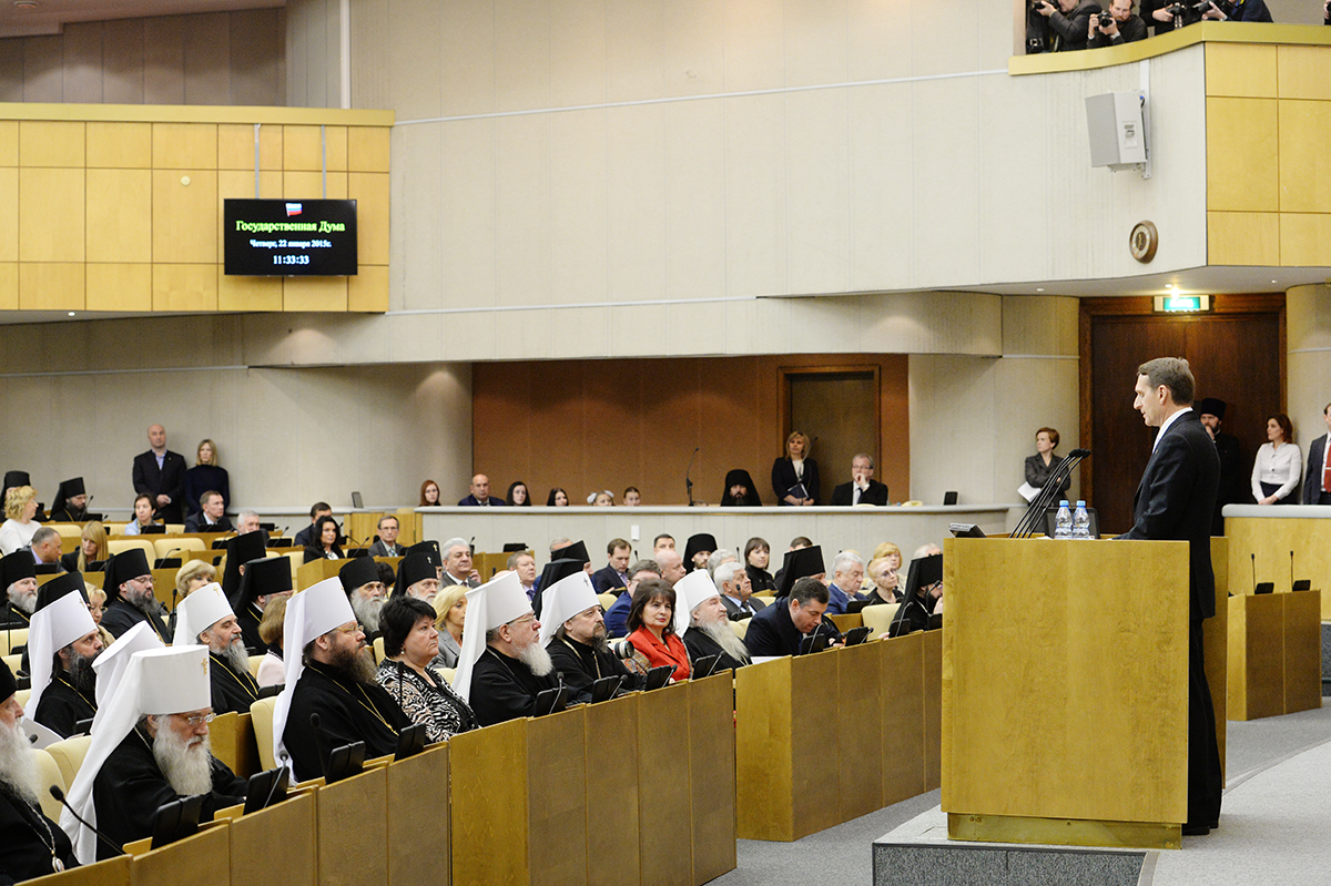 Уважаемый Сергей Евгеньевич! Уважаемые члены Совета Федерации, депутаты Государственной Думы, Преосвященные владыки, все высокое собрание!
