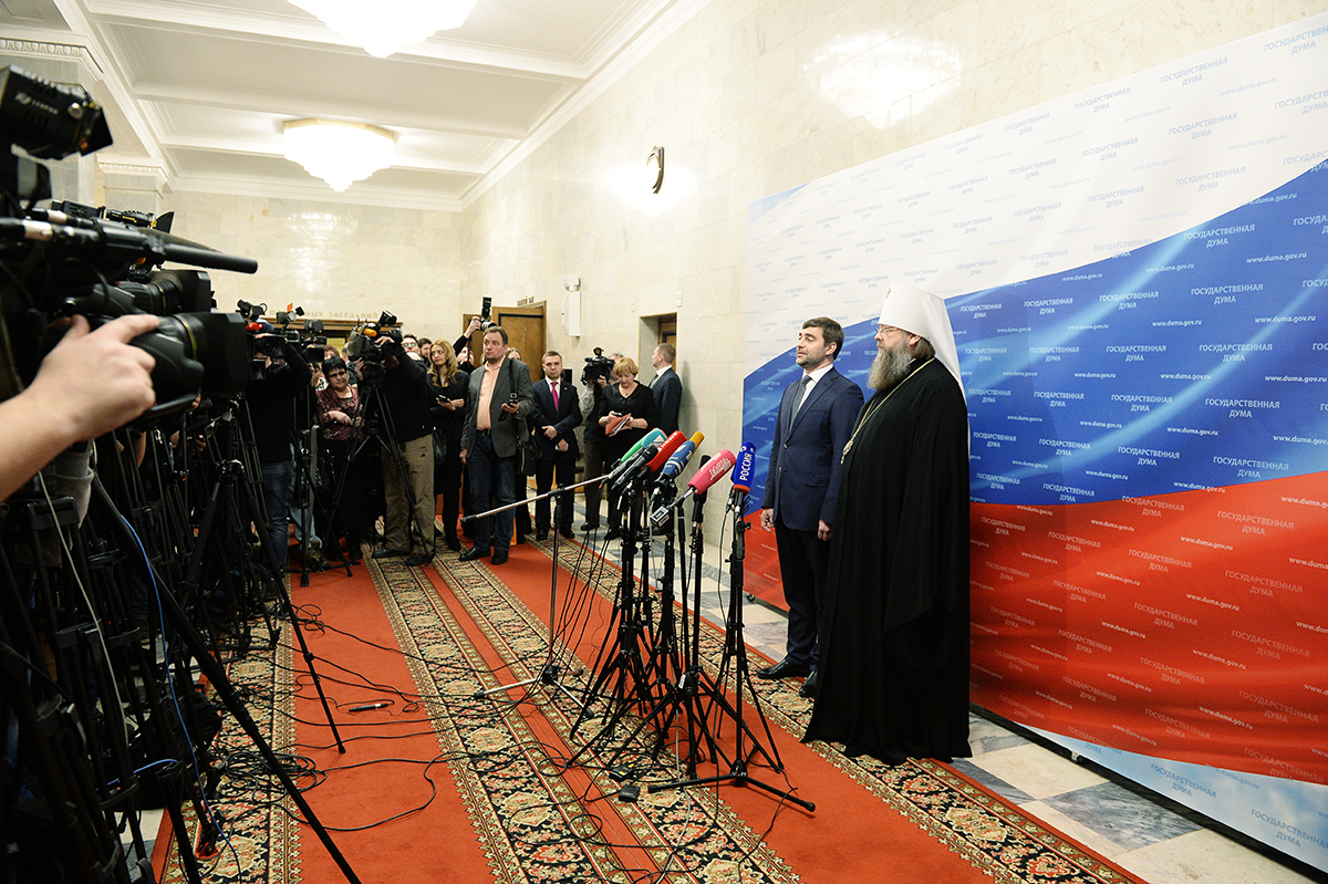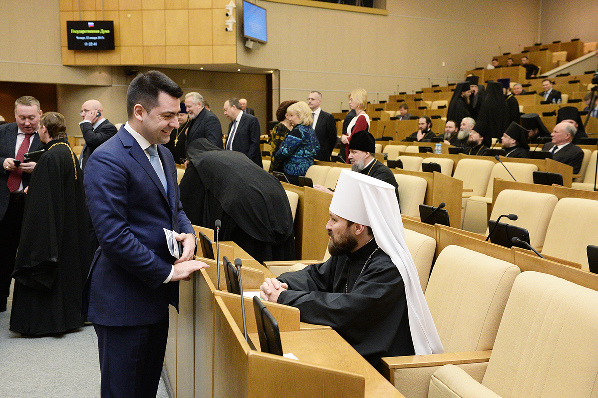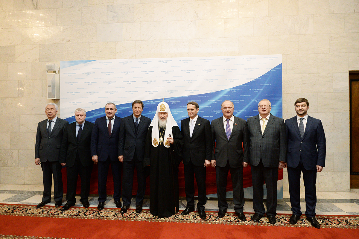Совместными усилиями Церкви, государственной власти и общества мы стремимся к тому, чтобы законодательство в религиозной сфере отражало динамичную реальность и одновременно не создавало затруднений для религиозных общин. Свидетельствую, что мнение Церкви в данной области, как правило, учитывается в законотворческом процессе. Хотел бы отметить твердую и ясную позицию обеих палат Российского парламента по таким актуальным проблемам, как защита чувств верующих и почитаемых ими святынь, сохранение и возрождение нашего культурного наследия, забота о судьбе ближневосточных христиан. Сердечная вам за это благодарность.