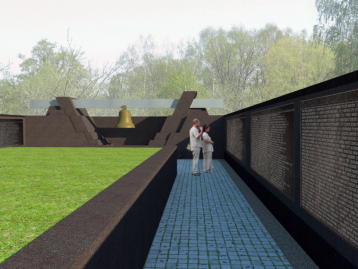В центре рва находится колокол памяти, в который человек может ударить. Я по себе знаю, что, спустившись в этот расстрельный ров, человек испытывает такие чувства, которые необходимо выразить. Несмотря на то, сколько лет мы это проектировали, пропускали через себя, сколько лет я буквально живу в этом мемориале, и все равно, каждый раз спустившись внутрь, я испытывал очень сильные эмоции, и колокол ― это универсальная метафора нашей общечеловеческой памяти о прошлом. Между этими двумя дорожками растет яблоневый сад ― символ того, что память должна жить и приносить плоды.
